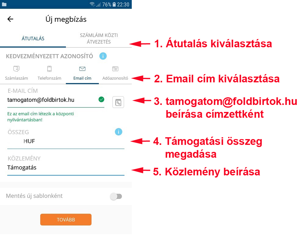 Utalásnál címzettként a név és számlaszám helyett az "Email cím" (vagy egyes bankoknál a "Másodlagos azonosító", majd az "Email cím") opciót kell kiválasztani az email cím beírásához. Támogatásodat előre is köszönjük!
